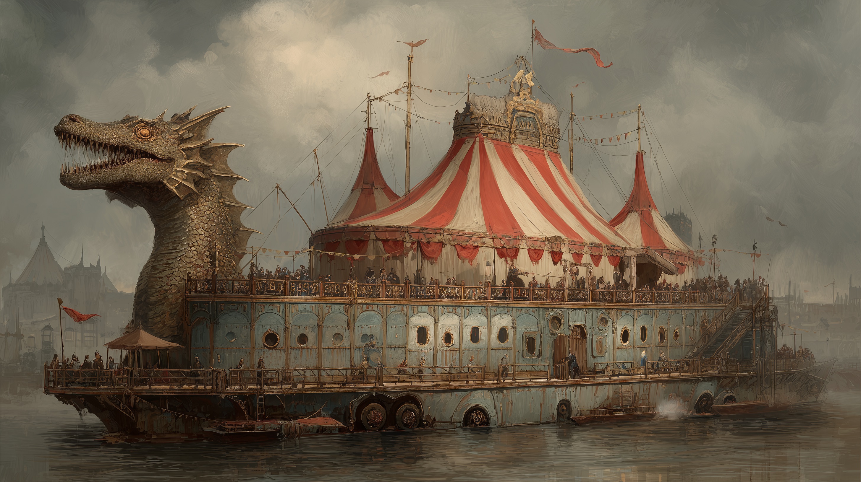 The barge’s most iconic feature, however, was the Bow Dragon: a massive figurehead salvaged from a wrecked pre-Burn ship. Its wooden scales were repainted every year in shimmering colours that caught the sunlight like oil on water. Children who watched it approach from the shore swore the dragon blinked. Old sailors claimed it protected the troupe. A few whispered that it demanded payment.