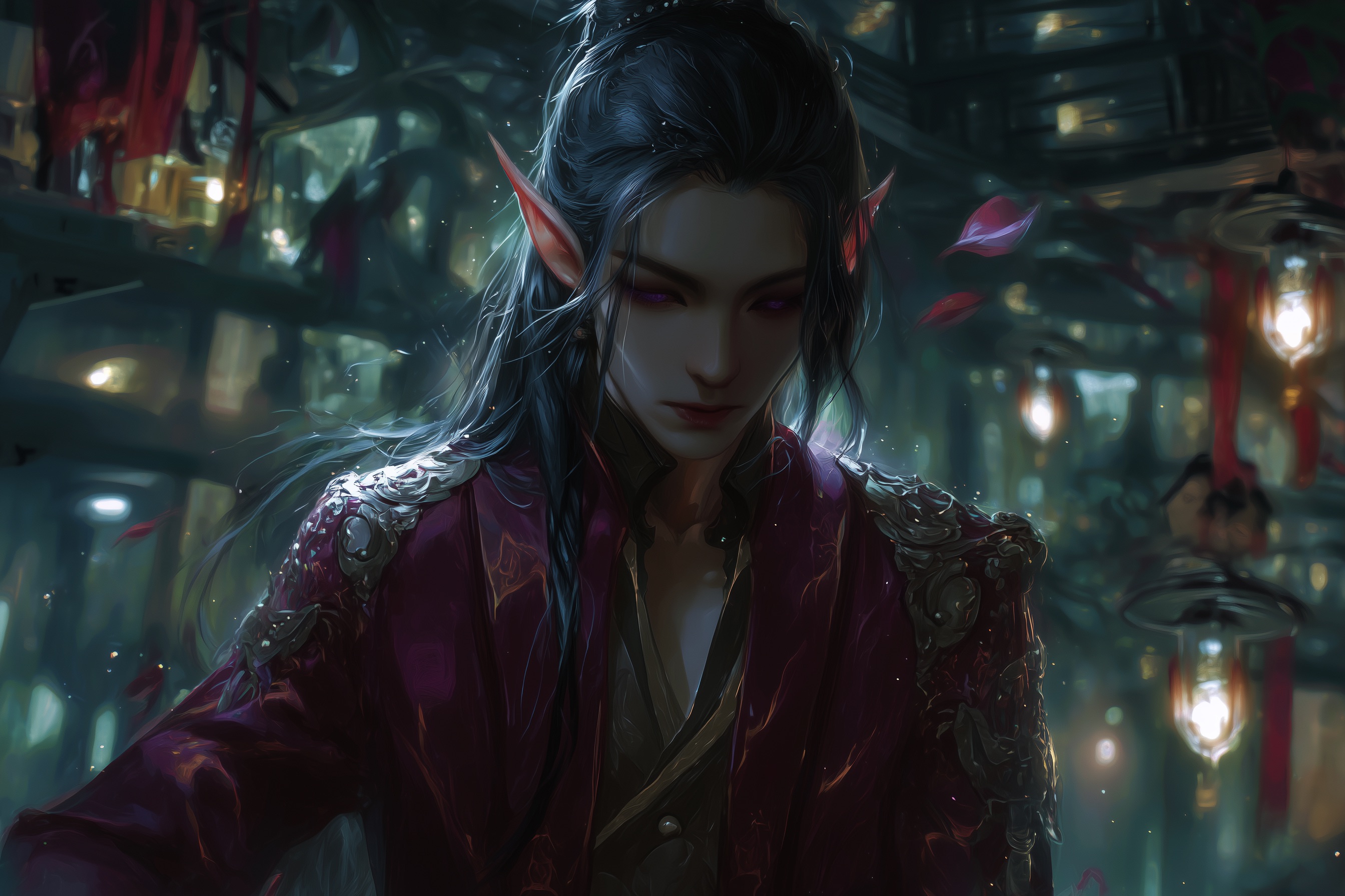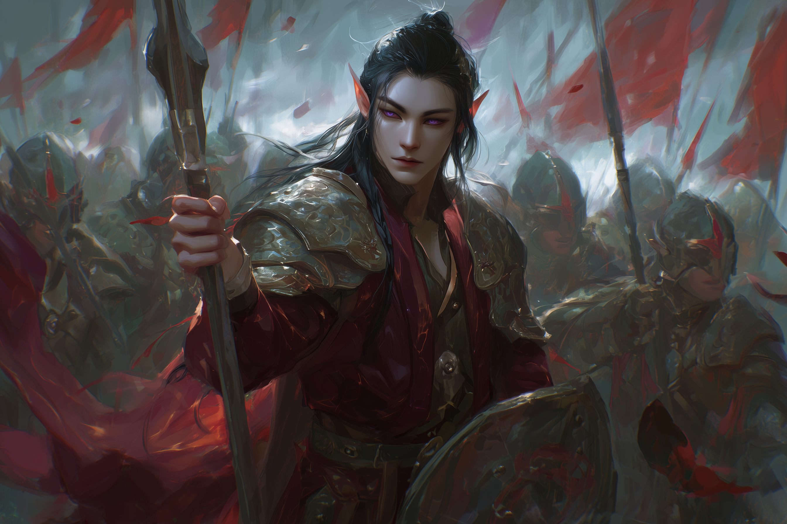 Prince Shin Han is widely regarded as exceptionally beautiful, even by Yun imperial standards. He possesses amethyst eyes, jet-black hair, and alabaster skin, with a lithe, toned physique shaped more by discipline than brute force. His sharply pointed ears mark his strong royal Yun lineage unmistakably. His presence is composed rather than imposing, his movements economical, his expressions measured.