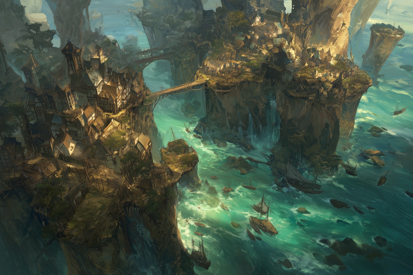 The third island is wholly different. Rising sharply from the sea, it forms the primary port and beating heart of Millmore. Cliffs and steep plateaus dominate its profile, forcing the city to grow vertically rather than outward. Entire districts cling to the mountainside like barnacles, connected by a web of wooden elevators, creaking ramps, and switchback stairs. Goods are hoisted by great cranes operated from upper terraces, while horses, wagons, and the majority of land-bound beasts of burden are confined to the lowest tiers where there is sufficient flat ground.