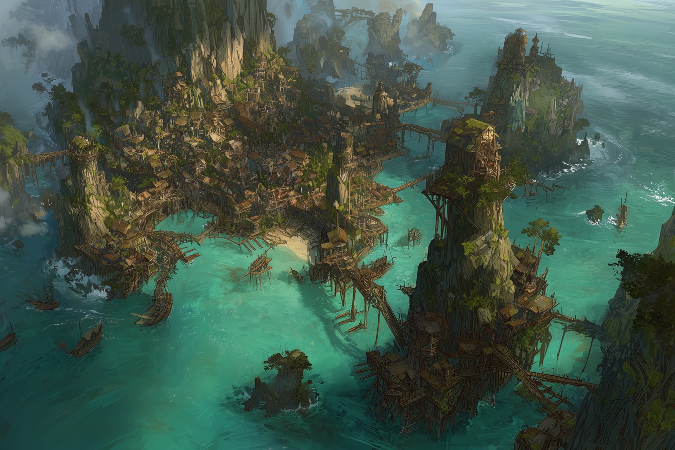 The city itself spans three small islands, bound together by slender fly bridges of lacquered wood and reinforced iron. Two of these islands are the remnants of an ancient landmass long since claimed by the sea. Their cores are the last surviving roots and trunks of what was once a colossal forest—now petrified, hollowed, and half-submerged. Buildings perch atop these natural pillars, creating a strange, layered landscape where homes sit atop root-masses and carved walkways spiral up the sides of stone-like timber.