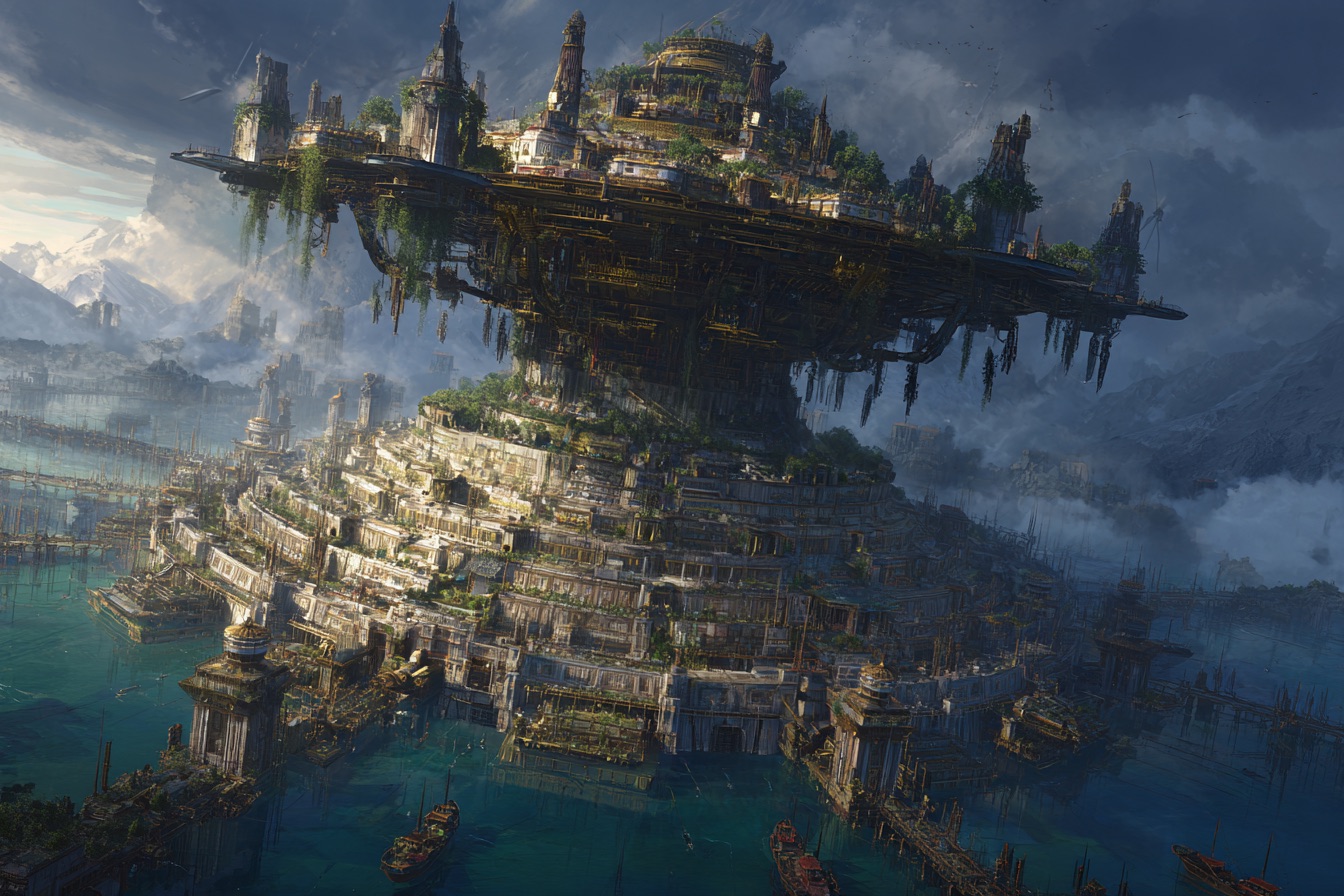 Between the ziggurat and the inverted pyramid bloom gardens that seem to float upon the wind. Vines spill like emerald waterfalls from balconies, heavy with fruit and perfume-sweet flowers. Pathways of lacquered wood and wrought iron curve through greenery, offering sweeping views of the ocean and the harbor ring. At night, bioluminescent lantern-pods glow pale blue between the leaves, turning the terraces into dreamlike hanging forests — a paradise suspended above stone and sea.