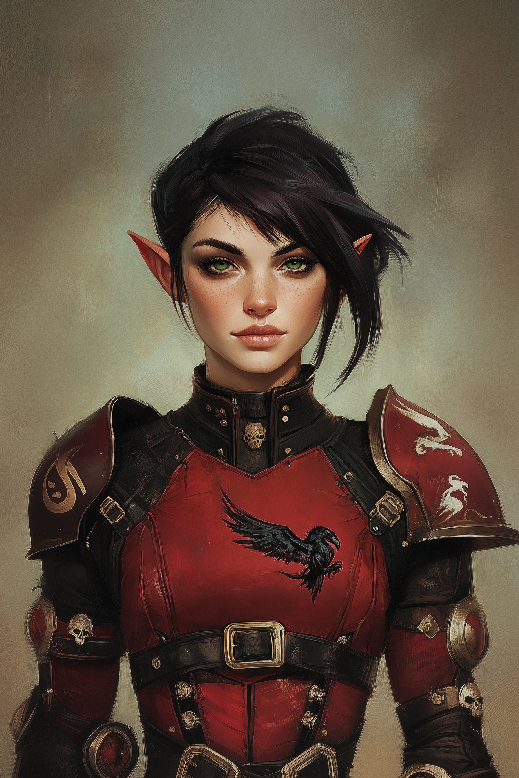 When she eventually joined the Ravengard Pipecross Team, she brought with her not only competitive talent but also Engineering insight. Over the years she refined her personal Pipecross suit, nicknamed the Pipecross rig, into a marvel of protective design: reinforced plating, lightweight pressure joints, shock-dispersing Leather layers, and her signature crimson-and-black color scheme. The raven sigil on her chestplate became synonymous with her style—sharp, resilient, unafraid.