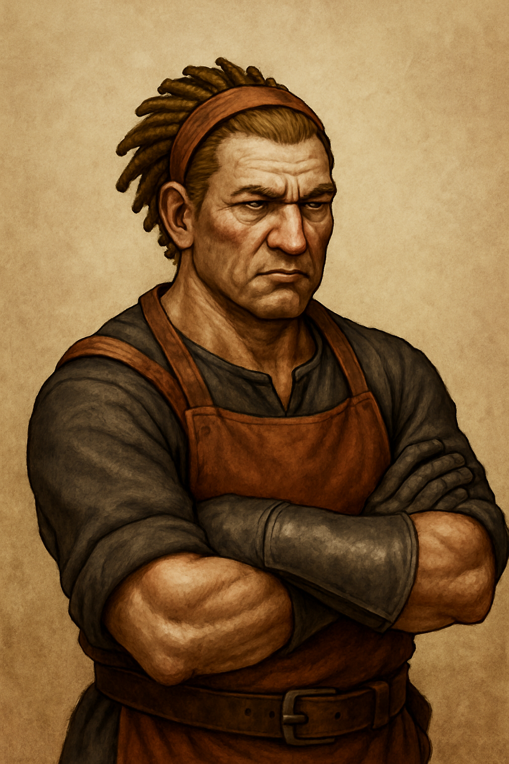 He has a square, resolute jawline and a prominent, straight nose. His lips are typically set in a thin, unsmiling line, though they are full enough to suggest a rare, softer expression beneath his stern demeanor. His eyes are a striking, deep forest green, often narrowed in thought, and they hold an intense, unwavering gaze that can feel both piercing and assessing. His hair is a practical, brown, and in short dreads to minimize upkeep.