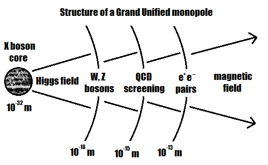 There is only one known type of magnetic monopoles, corresponding to the only first-order symmetry breaking event that took place during the Big Bang: GUT monopoles corresponding to the Grand Unified Scale at MX ≈ 1016 GeV (far above the Electroweak Scale, a second-order symmetry breaking event, where MW ≈ 102 GeV). Magnetic monopoles have a core of magnetic energy ~10-32 m radius. It is important to note that all monopoles have a rather complex structure outside of the core. Within a radius 10-18 m, magnetic charges are anti-screened or vanish and monopoles enter a bound state with one another in virtue of the Higgs Field post-electroweak symmetry breaking (see the diagram below of a monopole's structure). Beyond a radius of ~10-13 m monopoles behave like elementary particles: mere magnetic monopoles. The mass of a magnetic monopole is 1.03 x 1018 GeV, only 12 times less than Planck Mass (MP ≈ 1.22 x 1019 GeV or 22 micrograms).