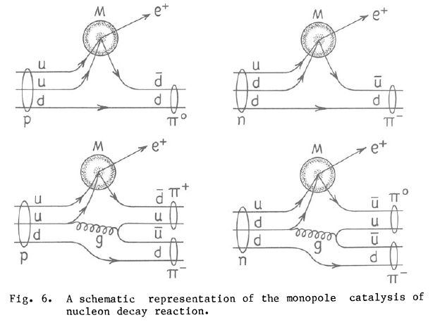 GUT monopoles interact with normal matter by inducing nucleon decay (e.g., proton and neutron decay). The proton decays into a positron (e+) and various pions (π0 or π±). Neutral pions decay into two gamma rays (γγ), and since the kinetic energy of the pions is relativistic (0.94c) both photons will move in the direction of the neutral pion (relative to the apparatus). Charged pions (π±) usually decay into a muon and muon-antineutrino, which the muon promptly decays into an electron and an electron-antineutrino. Hence, GUT monopoles can be used (over and over) to catalyze nucleon decay to provide a near 100% mass to energy conversion power systems and rocket engines, exhaust velocity 94% of lightspeed. As a bonus: this is all without needing to store extremely hazardous and expensive antimatter!