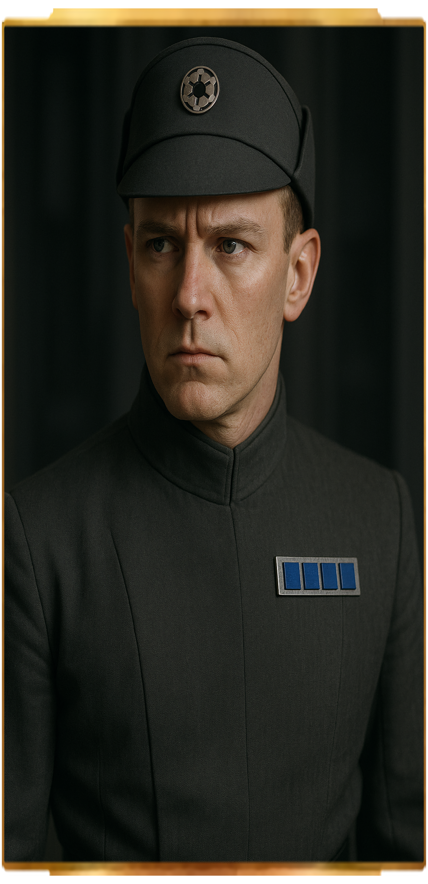 He is known among junior officers as “The Blackbird” for his piercing stare and knack for anticipating the moves of Rebel ships, though some see his unbending discipline as a liability in unpredictable engagements.