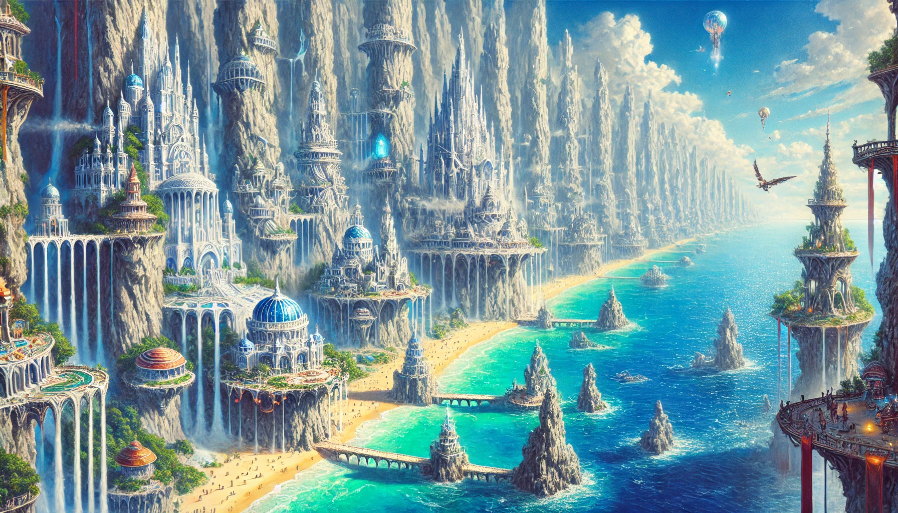 Instead, humanity has carved its home into the cliffs themselves. Great vertical cities cling to the sheer rock walls, built like colossal cave systems that tunnel inward and downward rather than outward. Windows and balconies overlook the endless drop, bridges of stone and wood connect hollowed districts, and light filters down through ingenious shafts carved into the rock. Life here is precarious, yet breathtaking: the air is filled with the sound of waves crashing far below, the cry of seabirds nesting in the cliffs, and the echo of hammers as new caverns are shaped into homes. The Walls of Grace remain a place of danger, wonder, and resilience—a land where survival depends not on conquering the heights above, but on mastering the vertical world that stretches endlessly toward the sea.