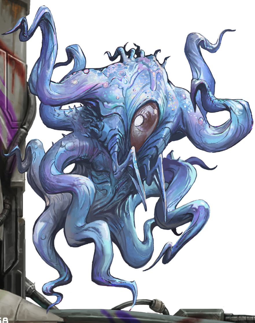 Amnieka is one of thirteen mortal Midwives who attended The Newborn’s birth and were transformed into eldritch entities by the nascent outer god’s awakening. A Midwife always regenerates an identical new form so long as even a single speck of aucturnite—the name for the frozen chunks of planetcenta that once surrounded The Newborn—exists on this plane. Amnieka is one of the thirteen types of Midwives, though whether there is only one Midwife of each type, or many, is unknown. Whether their names come from the mortal servants whose souls were the kindling for The Midwives’creation, or if they have some other significance to The Newborn, is a mystery. The only resemblance Amnieka bears to the humanoid body it may have once inhabited is the hood of writhing tentacles around its visage. Each Midwife identifies itself by how it cared for The Newborn. Amnieka swaddled The Newborn, but others fed, carried, held, watched, warded, blessed, or performed other acts of nurturing for the outer god.