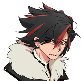 78 years of age, appears 25; black hair dyed with red stripes, brown eyes that go red when using magic; 5’8”