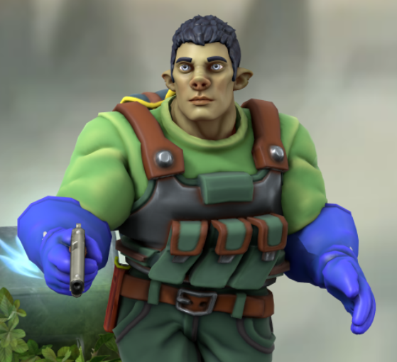 Cassius is fairly stereotypical of most orcs. Big. Muscular but not super jacked. mostly buzzcut black hair. Grey, almost silver eyes that absolutely reflect light like a cat's. he keeps clean shaven. He's also still pretty young, only about 22.