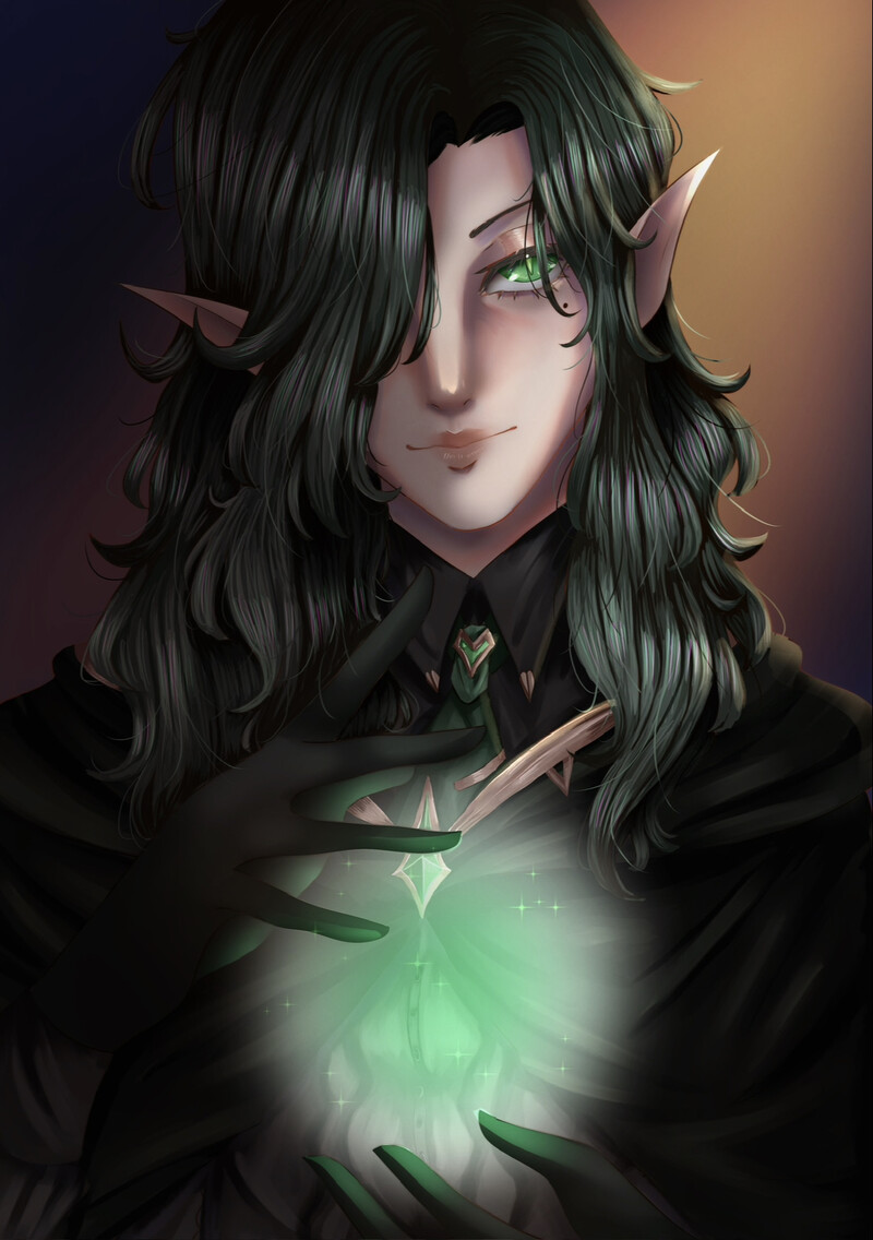 Jinn is a tall, thin elven man with pale skin a midnight black hair. His fingers are almost always tinted a faint bloody red color