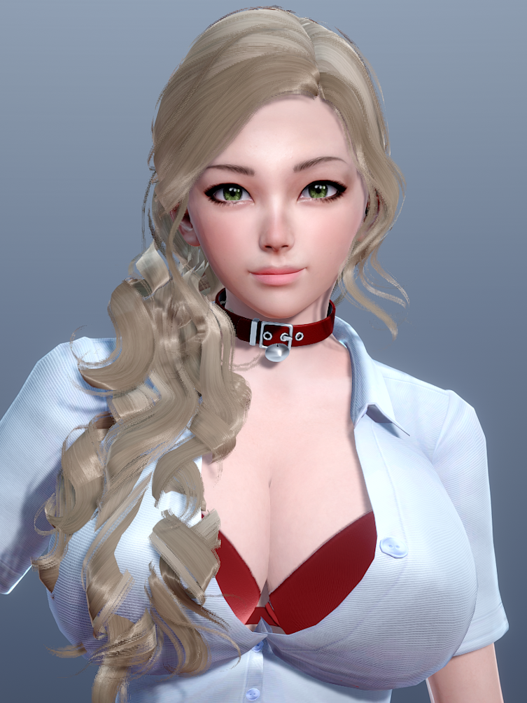 Voluminous hair, prominent bust and alluring figure, bright eyes