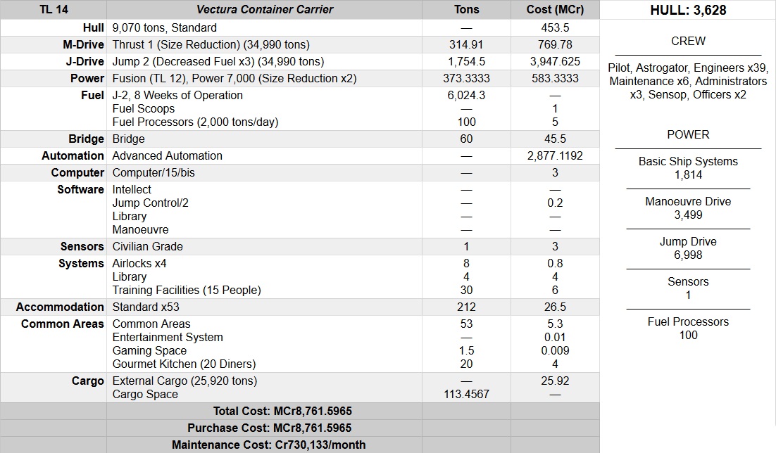 The Vectura is a 9,070 dTon container carrier designed for high-capacity cargo transport. Measuring 72 meters long, 72 meters wide, and 46 meters tall, the ship extends to 216 meters when fully loaded with 6,480 external cargo containers. While its internal cargo space is modest at 113 dT, the Vectura is optimized for hauling containers externally, offering up to 25,920 dT of additional capacity. Focused entirely on cargo transport, the Vectura is equipped with Thrust-1 and Jump-2 drives, but can reach Thrust-3 when running without external containers. It supports a crew of 53, offering staterooms, dining facilities, and recreational spaces to ensure comfort during long-haul voyages. With high levels of automation the Vectura offers reliable performance making it ideal for large-scale transport.