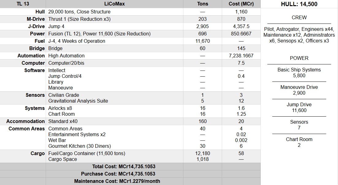 The LiCoMax Super Tanker is a colossal 29,000 dTon cargo vessel designed for bulk transport across the stars. Measuring 80 meters wide and 240 meters long, it offers 1,018 dT of internal cargo space and is optimized for external fluid storage, with the ability to mount tanks holding up to 12,180 dT. Powered by Jump-4 and Thrust-1 drives, the ship ensures reliable long-haul interstellar travel. It features civilian-grade sensors and a gravitational analysis suite to maximize operational efficiency. Despite its massive scale, the ship uses high automation to support a crew of 69, offering 40 staterooms and dining facilities for up to 30 at a time. Unarmed and unarmored, the Super Tanker is dedicated to cargo transport, setting a new benchmark for efficiency in fluid hauling.