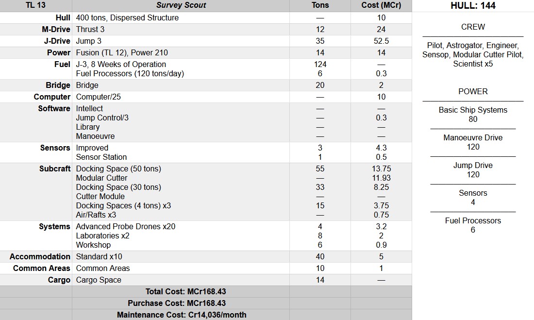 The Survey Scout is a dedicated exploration and mapping vessel, designed for the ongoing task of re-surveying the interior regions of a polity. Its primary mission is to update stellar maps and charts, maintain navigational beacons, and monitor astrogation hazards. Built on a 400 dT hull, the Survey Scout is equipped with Jump-3 and Thrust-3, allowing it to operate independently across vast distances. It features improved sensor arrays, a dedicated sensor station, and a complement of 20 advanced probe drones, enabling it to conduct extensive planetary and stellar surveys with precision. Onboard workshop and laboratory facilities allow for in-depth analysis and technical support during missions. The vessel’s modular cutter is often outfitted with a fuel skimmer module for wilderness refueling operations, while additional space for a spare cutter module provides versatile mission support. Further docking space for three Air/Rafts ensures planetary surface access and mobility. With accommodations for a full survey team across 10 staterooms, as well as 14 dT of cargo capacity, it is well-suited for extended missions in deep space.