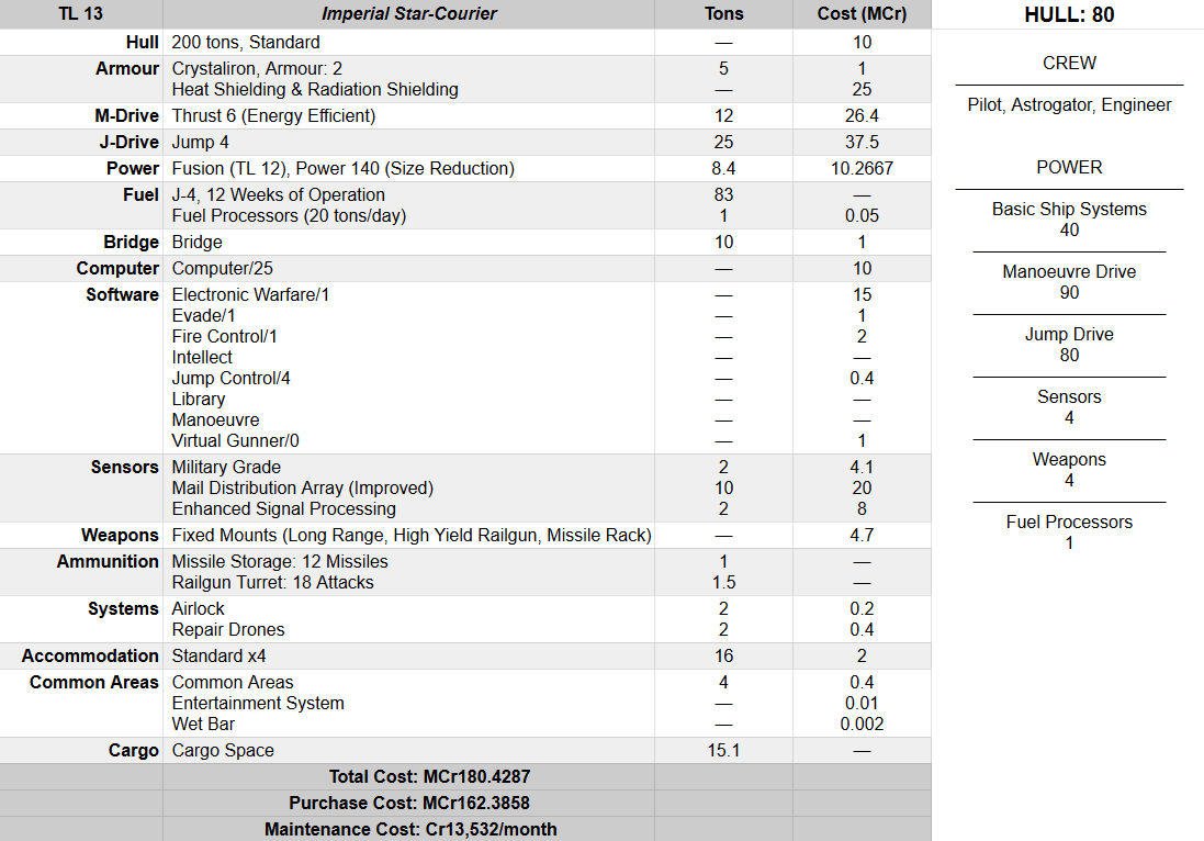 The Imperial Star-Courier is a 200 dT multi-role starship, originally built for the Dominion’s Imperial Scout Service (ISS) and now available as a decommissioned model for civilian use. Featuring Jump-4 capability and Thrust-6 maneuverability, it is powered by a TL-13 power plant, making it a reliable and versatile vessel. This decommissioned version retains two forward-facing twin weapon mounts at the wing tips for effective self-defense and includes its military-grade sensors and recoded data processing systems, ensuring solid navigation and data collection. Stripped of ISS-specific features such as the stealth coating, science lab, medical bay, and probe drones, it now offers a 15 dT cargo hold for ample storage space. The ship is equipped with four staterooms, providing comfortable accommodations for a mix of crew and passengers. The Imperial Star-Courier is ideal for those looking for a robust and adaptable ship capable of handling various roles, from exploration and reconnaissance to cargo transport and courier duties.