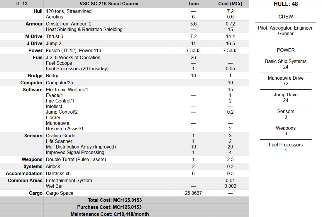 The VSC SC-216 Scout Courier is a versatile 120 dT ship designed by Vespian Shipyards Consortium. Its streamlined hull resembles an upscaled fighter craft, featuring a large foldable wing that stands vertically upwards when landed, enhancing its profile and functionality on planetary surfaces. Equipped with a Jump-2 J-Drive and Thrust-6 M-Drive, the SC-216 offers excellent performance and agility for a range of missions. Armed with a double turret and outfitted with a civilian-grade sensor suite, the SC-216 is often equipped with additional data processing or scientific systems, making it adaptable to various tasks. The crew quarters are designed with three bunk beds, accommodating up to six crew members. The cargo hold can vary in capacity up to 37 dT, depending on the sensory systems installed, with the most common configuration featuring a 25 dT hold. This combination of features makes the SC-216 ideal for scouting, exploration, and courier missions across the galaxy.