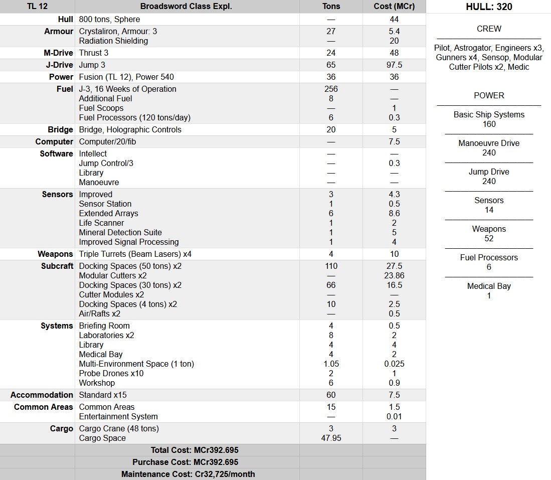 A highly adaptable variant of the Broadsword-Class Expeditionary Frigate, the Broadsword-Class Exploration Frigate trades its troop deployment capabilities for advanced sensor suites and scientific facilities, making it a formidable deep-space survey vessel. Retaining its 800 dTon spherical hull, Jump-3 capability, and Thrust-3 drives, it remains well-suited for long-range missions beyond established space lanes. The armament has been reduced to four beam laser turrets to accommodate additional sensor arrays and computational systems. Internally, the ship houses extensive research labs, expanded mapping and analysis stations, and enhanced data processing cores, enabling it to conduct planetary surveys, resource assessments, and astrophysical studies. While its operational costs place it beyond the reach of most independent explorers, it remains a favored platform for corporate survey teams and research institutes. With its blend of endurance, scientific capability, and rugged self-sufficiency, the Broadsword-Class Exploration Frigate is a premier choice for charting the unknown.