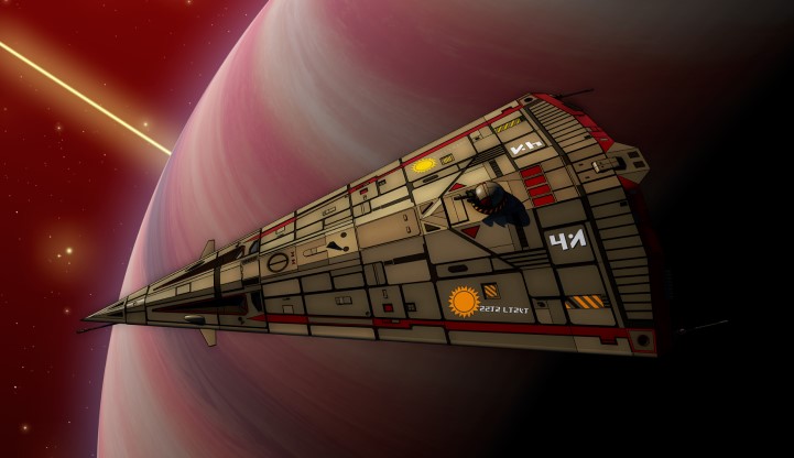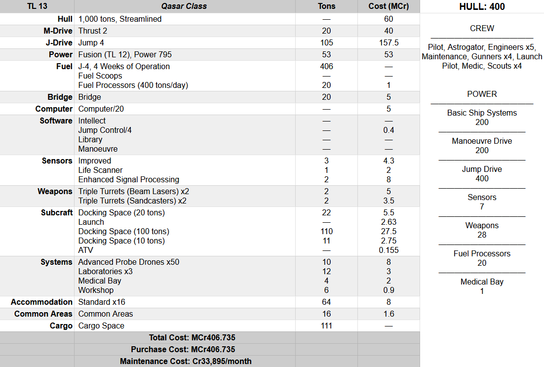 The Qasar-class Scout Frigate designed to support long-range scouting missions in uncharted territory. The design incorporated multiple levels of redundancy required to survive months or even years at a time out of contact and has proven so reliable it continues to be used on the frontiers. Because of its mission profile, the Qasar has some defensive capability, sporting two triple sandcaster turrets and two triple beam laser turrets. Qasars usually carry a scout/courier, used as a large ship’s boat allowing extended missions away from the parent vessel jumping to neighbouring systems to widen coverage of the mission.