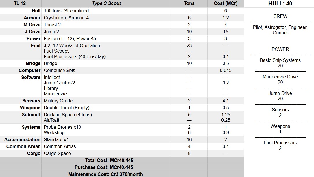 A versatile vessel designed for exploration, survey, and courier duties, the Scout Ship has been a staple of deep-space operations since the Galactic Imperium era, with thousands still in service. Despite its compact 100 dTon streamlined hull, it is faster and more capable than most merchant vessels, featuring Jump-2 and Thrust-2 for extended-range missions. Built for self-sufficiency, it is often crewed by just one or two highly skilled individuals, though multiple stations are available. The ship's Crystaliron armor plating provides added protection, while its military-grade sensors and ten probe drones make it ideal for reconnaissance and survey work. Armed with a double turret, it can defend itself against light threats. Additional features include four staterooms, a workshop, docking space for an Air/Raft, and 8 dT of cargo capacity, making it a highly adaptable vessel for frontier operations, intelligence gathering, and planetary surveys.