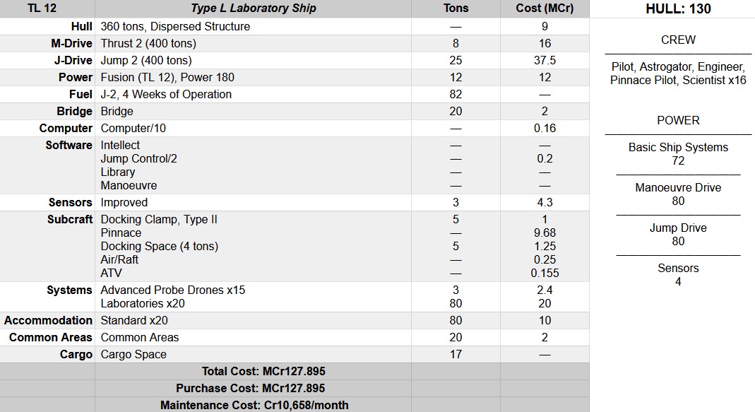 A highly specialized research vessel, the Laboratory Ship is designed to transport scientists and equipment across the stars for remote and deep-space studies. Equipped with improved sensor arrays and 15 advanced probe drones, it excels at planetary surveys, astrophysical research, and biological studies in isolated environments. A unique feature of the ship is its rotational gravity system, which allows experiments to be conducted without interference from standard gravitic plates. For field expeditions, a Research Pinnace is carried via docking clamp, modified with a fuel processor and cargo module to support long-duration missions and surface operations. While typically staffed with a full complement of scientists and crew, the Laboratory Ship is designed to be operated by as few as two personnel when necessary. Additionally, the ship houses laboratories, 20 staterooms, 15 dT of cargo space, and a docking bay for an Air/Raft. With Jump-2 and Thrust-2, the Laboratory Ship is a premier choice for scientific institutions and corporate research teams operating in the frontier.