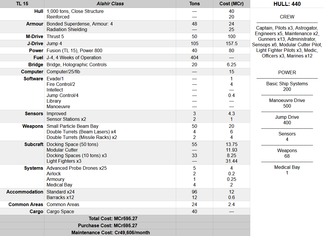 Designed for deep-space exploration and reconnaissance, the Alahir-Class Scout Frigate serves as the cutting edge of fleet pathfinding operations. Built on a 1,000 dT hull, it boasts Thrust-5 and Jump-4 capabilities, enabling it to traverse vast distances and operate independently in the most remote and uncharted regions. While officially designated as an exploration vessel, its advanced sensor suites, high mobility, and stealth capabilities make it an ideal platform for intelligence gathering and covert operations. The Alahir carries a modular cutter for planetary excursions and logistics, along with three light fighters for reconnaissance, escort duties, or rapid response scenarios. Though not heavily armed compared to dedicated warships, it is well-defended, featuring a mix of energy and point-defense systems to deter hostiles. Its streamlined, durable hull allows it to withstand long-duration missions, whether charting unknown star systems, securing strategic hyperspace routes, or engaging in high-risk espionage. A crucial asset for any fleet or intelligence network, the Alahir-Class blends exploration with military versatility, making it a formidable presence wherever it operates.