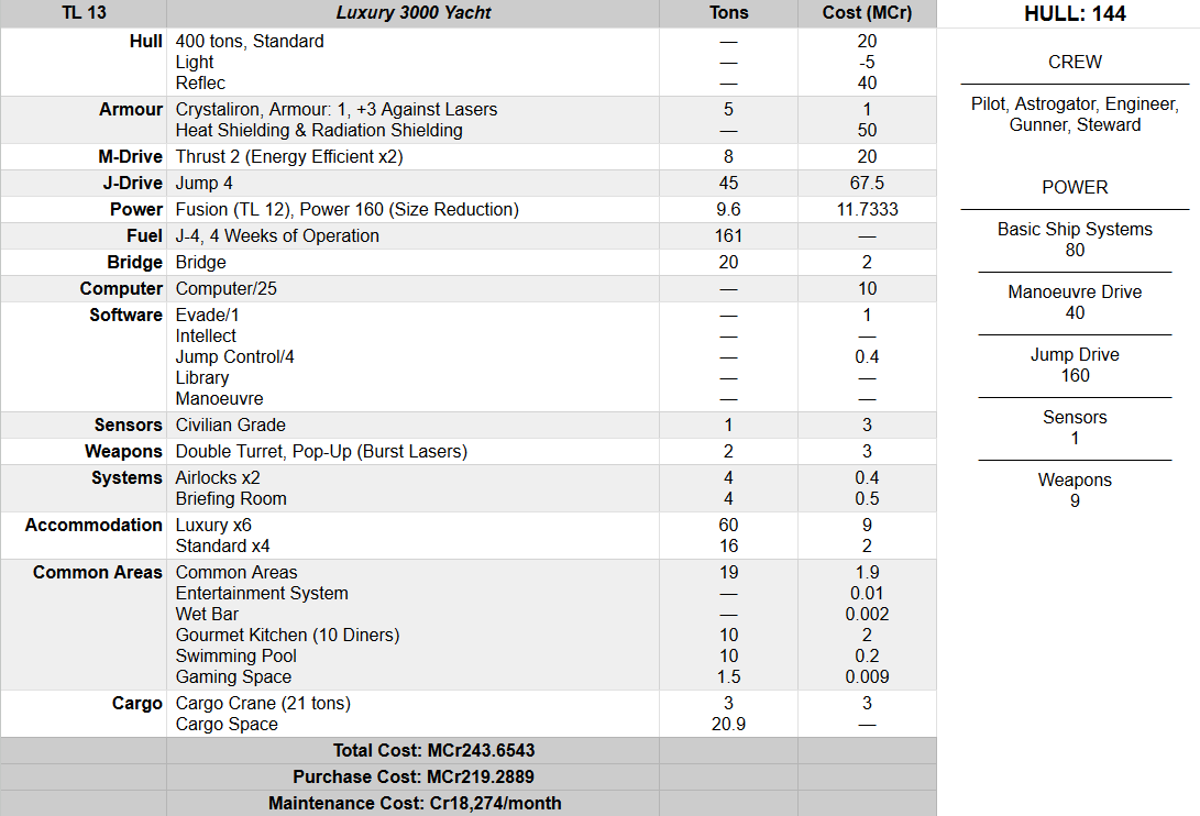 The Luxury 3000 Yacht is a 400 dT ship from Loanor-Sorosub, It features a Jump-4 J-Drive and Thrust-2 M-drive ensuring long-range travel with comfortable speed. Originally marketed as the Sorosub 3000 Luxury Yacht, after the Loanor-Sorosub Merger its been officially rebranded to the colloquially known Luxury 3000, due to continued popularity. The ship comes equipped with a ready powerplant and has four hardpoints for customizable weapon installations, with a default configuration including a single pop-up twin laser turret for self-defense. Civilian-grade sensors provide reliable navigational and security capabilities. The interior of the Luxury 3000 includes four Staterooms for 4-8 crew members and six Luxury Stateroom for 6-12 high-end passengers. upscale amenities including a gourmet dining facility for 10 diners, a swimming pool, a gambling space, and a bar. The yacht also retains a 20 dT cargo space. all of which can be completely reconfigured to fit customer´s needs. The Luxury 3000 exemplifies the fusion of luxury and versatility, making it an exceptional choice for those seeking style, comfort and customization in their space travel experience.