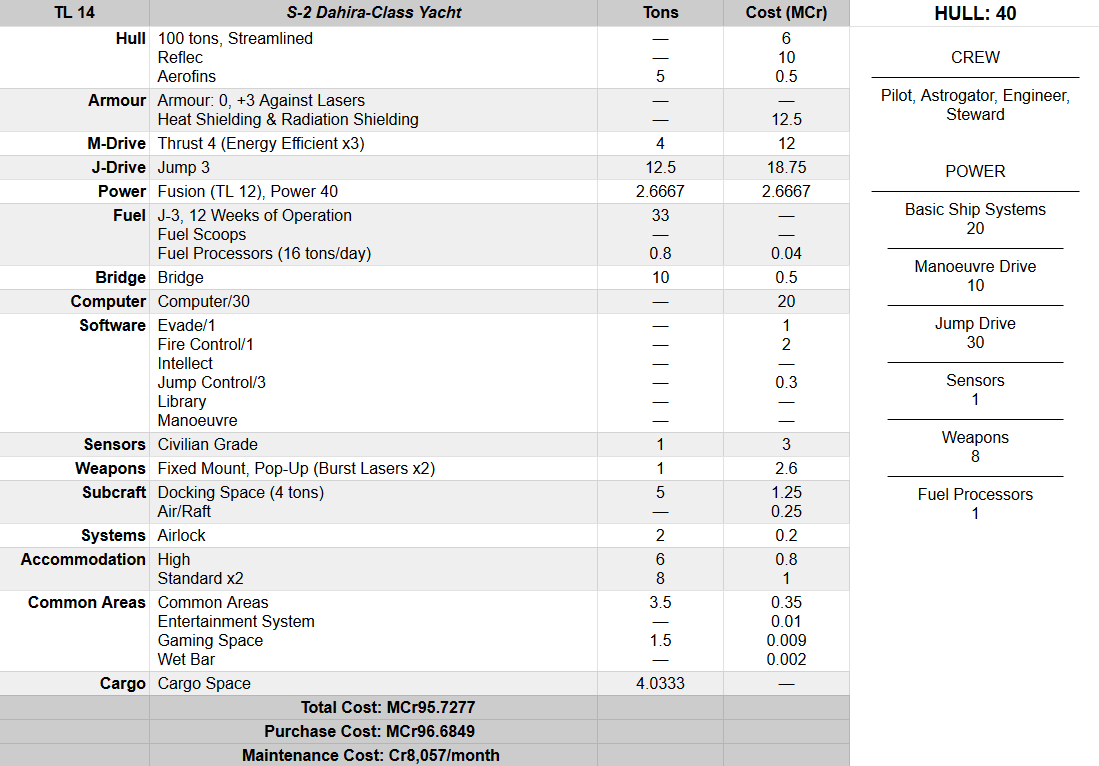 The Dahira-Class Yacht is a sleek 100 dT vessel designed for luxury and performance. With a Jump-3 drive and Thrust-4 maneuvering capability, it offers impressive range and agility for swift interstellar travel. For self-defense, it features twin frontal pop-up lasers discreetly integrated into the ship's design. Inside, it features two standard staterooms and one high-class stateroom, accommodating up to four crew members and one to two high-end passengers. The 9 dT cargo hold provides ample space for an Air/Raft or other personal vehicles, along with room for supplies. The S-2 Dahira-Class Yacht is perfect for travelers seeking luxury, performance and sophistication in their journeys.