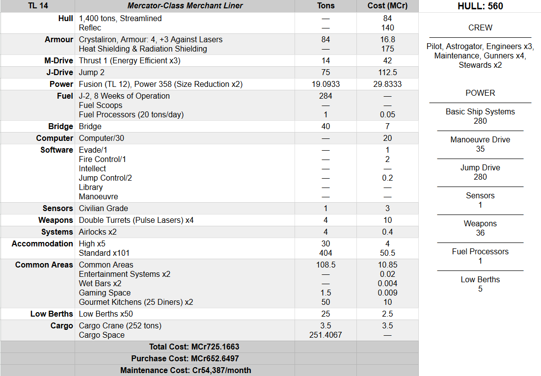 The Loanor-SoroSub Mercator-Class is a 1,400 dT vessel designed for luxury and efficiency in passenger transport. Featuring Jump-2 and Thrust-1 capabilities, this liner is built with a well-armored exterior and civilian-grade sensors, prioritizing both safety and durability. The design includes four hardpoints and a ready-made power plant, giving owners the flexibility to add weapons either at the time of purchase or during a later refit, although additional armament would reduce passenger capacity due to increased crew requirements. The ship is well-appointed with 101 standard staterooms, 5 high-end staterooms, and 50 low berths, accommodating a crew of 8-12 and up to 196 passengers. Multiple common areas enhance passenger and crew comfort, and the liner includes two dining facilities capable of seating up to 25 diners each. With a cargo hold ranging from 250 to 255 dT, depending on whether weapons are installed, the Merchant Liner provides ample space for passenger luggage and mercantile goods, making it an ideal choice for commercial transport and luxury travel.