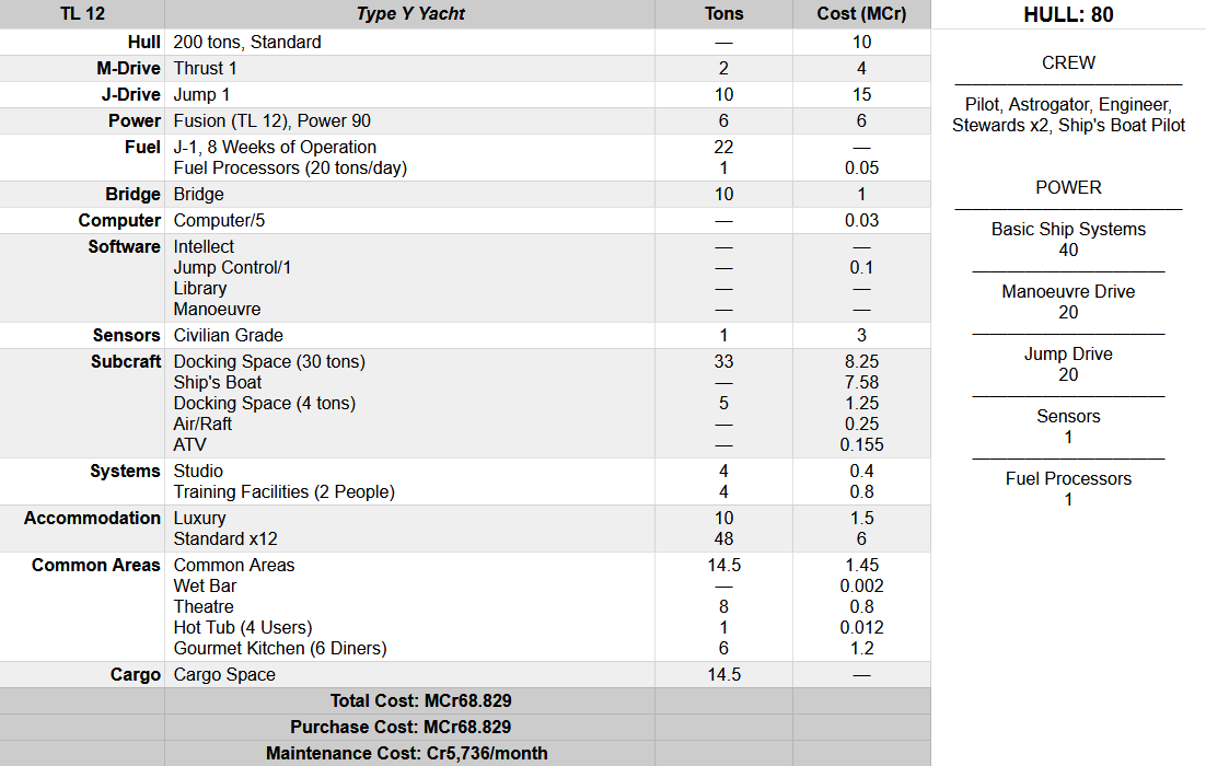 The Type Y Yacht is a 200 dT vessel designed for luxury, prestige, and comfort in interstellar travel. With Thrust-1 and Jump-1 capabilities, it is ideal for leisurely voyages, diplomatic excursions, and high-profile business dealings. The yacht features 12 standard staterooms and a single opulent luxury suite reserved for the owner, ensuring accommodations befitting nobility or elite clientele.Designed for both entertainment and function, it boasts a salon studio, a fully stocked bar, a gourmet dining room for six, an onboard cinema seating eight, a small gym, and even a hot tub for ultimate relaxation. The ship’s docking compartments house an air/raft for planetary excursions and a ship’s boat, which can ferry the included ATV between orbit and surface. A noble’s plaything and a statement of wealth, the Type Y Yacht serves as both a floating retreat and a platform for political and commercial endeavors, ensuring its owner travels in style without sacrificing utility.
