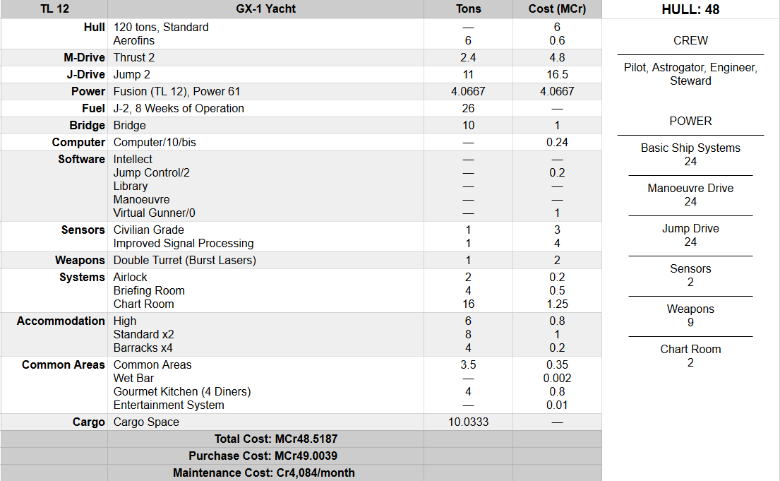Introducing the 120 dTon GX-1 from Lantillies Shipwrights, a beacon of luxury and versatility in the cosmos. With a Jump-2 drive and Thrust-2 manoeuvrer drive, it ensures seamless travel through space. Equipped with an automated turret for security, you can embark on your journey with confidence. Featuring aero-fins that tilt during flight for enhanced atmospheric performance, this ship combines functionality with elegance. The Yacht configuration offers a refined experience, boasting 10 dTon cargo space and accommodations for 1 high passenger and 2 guests, all attended to by a crew of 4. For those prioritizing efficiency, the Data Runner configuration provides enhanced signal processing and advanced mail distribution, catering to your data needs with precision, while offering less cargo space based on your selected configuration, accommodations, and amenities. In the Shorthauler configuration, enjoy a spacious 51 dTon cargo hold, prioritizing cargo over accommodations and amenities. Whichever configuration you choose, the GX-1 exceeds expectations with its unmatched elegance and style.