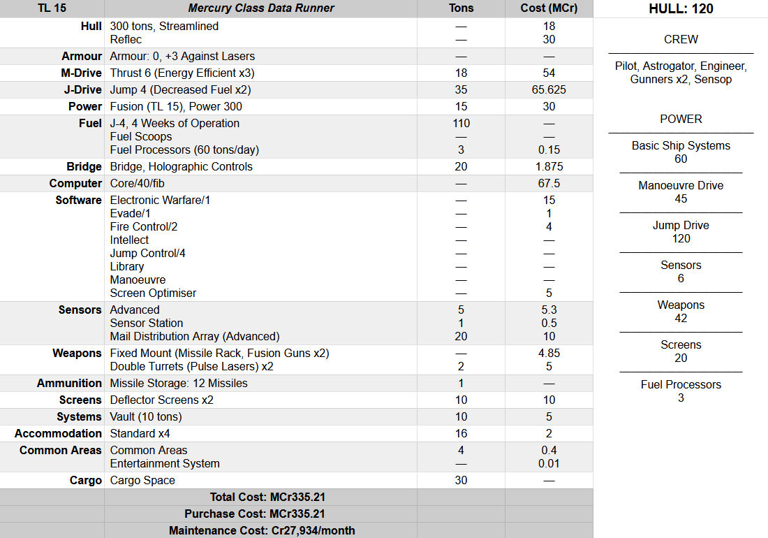The Mercury-Class Data Runner is a high-speed, high-security courier vessel built for rapid interstellar data transmission. Its 300 dT streamlined hull, coated in reflec, ensures speed and survivability, while Thrust-6 and Jump-4 make it one of the fastest ships in its class. Outfitted with advanced sensors, a dedicated sensor station, and an advanced mail distribution array, the Mercury excels at secure, high-speed data transfer. Its holographic bridge controls and state-of-the-art computer core further enhance efficiency and reliability. Though built for speed, the Mercury carries dual fusion guns, a missile rack, two double pulse laser turrets, and deflector screens, providing ample defense. Inside, it features four staterooms, a 10 dT secure vault, and a 30 dT cargo bay, balancing security and storage. Fast, well-equipped, and built for critical missions, the Mercury-Class is ideal for express couriers, data runners, and high-priority government or corporate contracts, ensuring vital data and cargo reach their destination safely and on time.