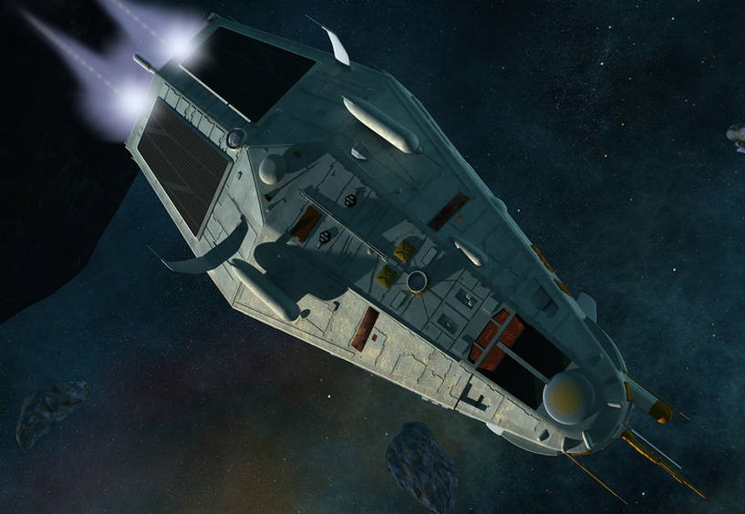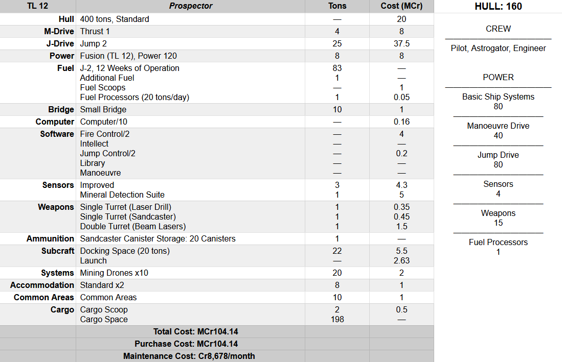 Not all belters scrape by in rusting junkers, barely held together by scavenged parts and luck. Some strike it rich—or at least rich enough to invest in something better. The 400 dT Prospector is built for those who have outgrown their humble seeker ships, offering greater range, durability, and protection in deep-space mining operations. Equipped with Jump-2 and Thrust-1, it can operate independently for extended periods, scouting out promising asteroid fields beyond the reach of casual competitors. Designed for efficiency, it boasts improved sensors with a Mineral Detection Suite and mining drones, and a large bulk cargo hold allowing crews to haul large quantities of ore to port. Its self-defense turrets provide a measure of security against pirates eager to claim another prospector’s hard-earned haul. With comfortable staterooms for long-duration missions, ample cargo capacity, and robust fuel reserves, the 400 dT Prospector is the ship of choice for belters ready to take their fortune-hunting to the next level.