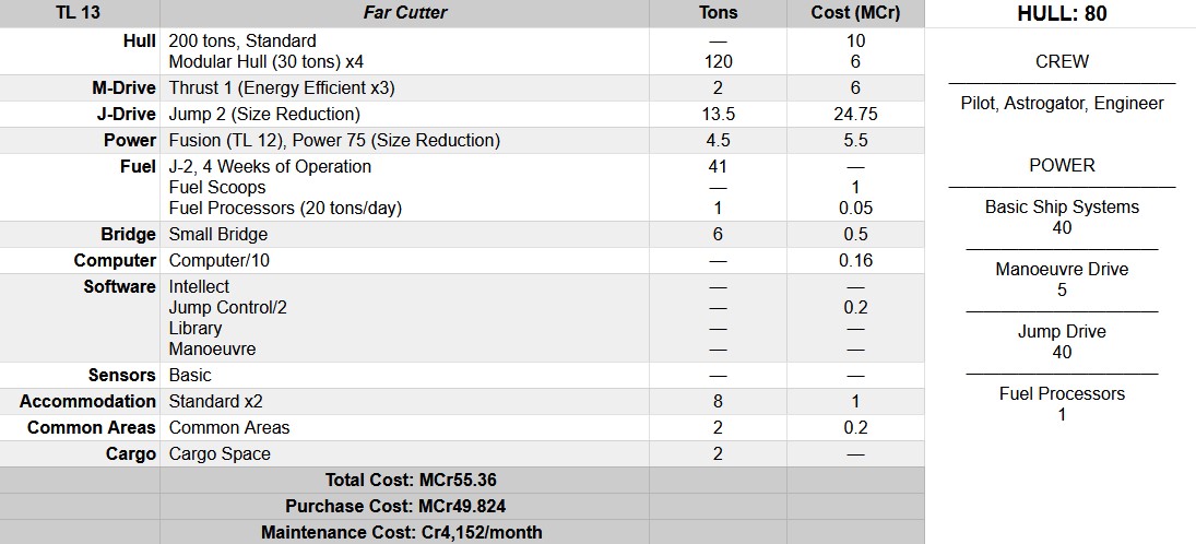 From TL-13 onward, a variant of the standard 200 dT Jump Cutter became available, sacrificing some crew comfort—reducing accommodations to just two staterooms and 2 dT of cargo—in exchange for Jump-2 capability at a similar cost. Retaining the ability to mount four standard modules, this variant significantly enhances its utility in frontier space, where greater range allows it to operate beyond established trade routes and reach remote colonies in need of vital supplies and support. Designed with versatility in mind, the Jump Cutter remains an invaluable asset, capable of taking on nearly any role with the right equipment at a well-supplied starport. Whether running cargo, skimming fuel from gas giants, supporting fledgling colonies, performing search-and-rescue missions, or acting as an auxiliary support craft in fleet operations, its adaptability makes it a favorite among independent operators, explorers, and even military forces. While its cramped living conditions make extended deployments challenging, its expanded reach ensures that it remains a lifeline in the vast expanse of space.