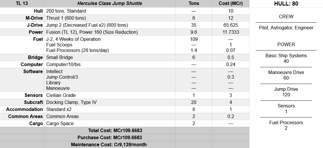 The Hercules-Class Jump Shuttle is built to carry heavy loads across the stars with exceptional strength and endurance. Designed for interstellar transport of ships incapable of jump travel, this rugged shuttle is perfect for moving system defense boats, in-system bulk haulers, or even disabled starships in regions lacking repair facilities. While compact in design, the Hercules-class is a powerhouse, capable of achieving Thrust-3 Jump-3 on its own, or carrying ships up to 400 dT with Thrust-1 Jump-2. Though it cannot perform consecutive jumps while carrying its full capacity, the shuttle remains an invaluable asset for long-range rescue, logistics, and emergency operations. With a small crew and minimal onboard facilities, the Hercules-Class is a no-frills workhorse built to get the job done—strong, resilient, and always ready to bear its burden.
