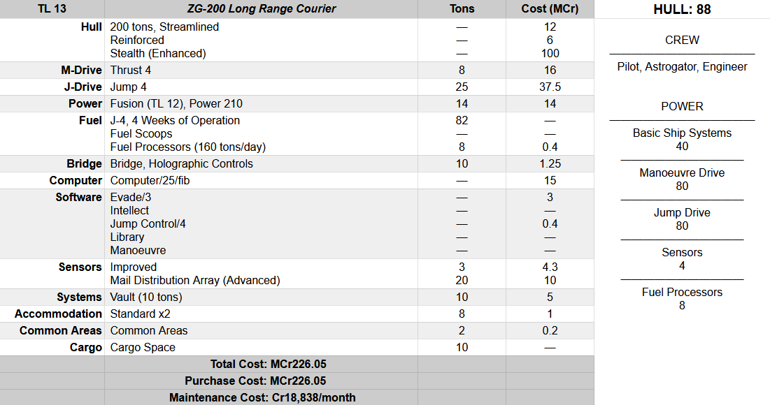 The ZG-200 Long Range Courier, crafted by the Zygherrian Shipwrights Guild, is a high-speed vessel designed for express couriers, data runners, and those needing to traverse vast distances undetected. Originally built exclusively for the Zygherrian Market, it is now available to anyone who can afford it. With Thrust-4 and Jump-4, enhanced stealth coatings, and improved sensors, the ZG-200 is built for speed and discretion. It features an advanced mail distribution array for secure, high-speed data transmission, a reinforced 10 dT vault, and a 10 dT cargo hold. Two staterooms provide essential accommodations for its crew. Making it a premier choice for express couriers and data runners who need to traverse vast distances without delay. While typically unarmed, the ZG-200 can be reconfigured with weapon systems if desired. Its sleek profile and high-speed capabilities have made it a favored choice for the wealthy, who have refitted it into small, fast yachts. While most serve legitimate roles, its speed and stealth also make it popular among smugglers and information brokers. Whatever the purpose, the ZG-200 ensures its owner stays ahead of the competition.