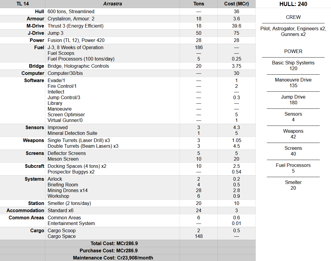 The Arrastra-class Mining Ship is a modern workhorse built with a deliberate nod to the past. Designed to evoke the powerful naval vessels of the Galactic Imperial Era, its angular hull and reinforced frame call back to a time when imperial might ruled the spacelanes. Developed for Corporate mining and independent deep-space operators, the 600 dT streamlined hull is optimized for frontier operations, featuring Jump-3 and Thrust-3 for long-range expeditions beyond well-mapped systems. Equipped with six hardpoints, it carries a mix of mining lasers and defensive turrets, ensuring it can extract resources while holding its own against opportunistic raiders. Mining drones, an onboard smelter, and a cargo scoop make for highly efficient ore processing, while its expansive cargo hold, accessible via a rear ramp, supports both bulk storage and ground-based mining ops. The Arrastra’s silhouette and rugged construction have made it a favorite among the Mining Guild and those who prefer their working ships to look as formidable as they are functional.