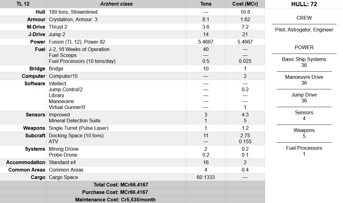 A compact yet highly capable vessel, the Arzhent-Class Prospector/Surveyor is designed for mineral exploration, planetary surveys, and resource scouting in frontier space. Built for independent operation, it is favored by prospecting guilds, corporate survey teams, and freelancers seeking untapped wealth in uncharted systems. At 180 dT, the Arzhent is equipped with Jump-2 and Thrust-2, offering solid range and maneuverability for deep-space operations. Its improved sensors, fitted with a mineral detection suite, allow for precise geological scans, while a mining drone and probe drone provide remote surveying and sample collection capabilities. Defensively, the vessel carries a single pulse laser turret, operated via an advanced computer with a virtual gunner, ensuring automated protection against minor threats. The ship also features docking space for one ATV, 60 dT of cargo capacity, and four staterooms, offering comfortable accommodations for a small crew. Practical, rugged, and well-suited to the demands of exploration and resource extraction, the Arzhent-Class is a trusted companion for those who seek their fortune in the vast unknown.