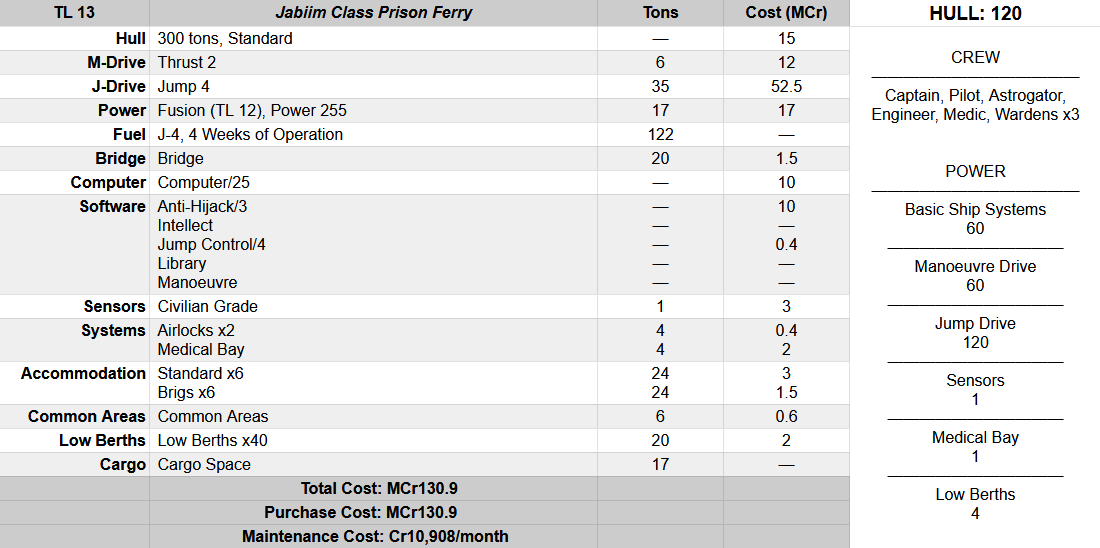 The Jabiim-Class Prison Ferry is a purpose-built vessel designed for the secure transport of convicts and detainees. While any merchant or liner could be converted into a prison transport, this design is favored for its ruggedness. Built on a 300 dT hull, the Prison Ferry is equipped with Jump-4 and Thrust-2, prioritizing long-range travel over sublight speed. Its high jump capability minimizes stops, reducing security risks and escape attempts. While commonly unarmed, it has three hardpoints for optional weapons. A reinforced brig and 40 low berths ensure secure containment, with a med bay for necessary medical care. The vessel includes six staterooms for crew and security, with only the most spartan amenities to maintain order and efficiency. Many worlds operate their own prisons, but certain governments and organizations rely on infamous prison planets. Transporting prisoners through open space is inherently risky, and while its design minimizes threats, Prison Ferries are almost always assigned a close escort for protection.