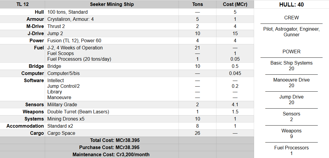 The Type J Seeker Mining Ship, a 100 dTon vessel, inherits its lineage from the scout/courier design from the Galactic Imperium era. Boasting a Jump-2 drive and Thrust-2 manoeuvrer drive, it promises efficient space travel across asteroid-rich environments. With 26 tons of cargo space, it offers ample capacity for mineral extraction and transportation. Equipped with 5 mining drones and specialized hull doors for direct mineral deposition, it optimizes the mining process with precision and speed, though it comes at a cost of passenger space and fuel. Often derived from retired Scout vessels, it benefits from the robust framework and adaptable design of its predecessors. Additionally, it commonly integrates a turret for self-defence, ensuring operational security in hazardous mining regions, enabling skilled prospectors to scour asteroids for valuable minerals, offering a livelihood in the depths of space.