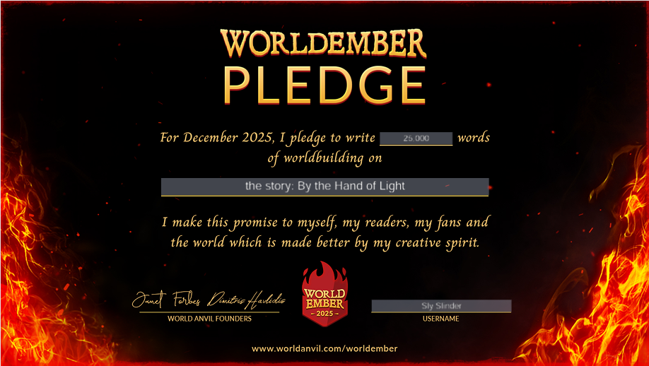 I am pledging to write at least 25k words for my world, focusing on the information to my story, By the Hand of Light. Even though I have been using World Anvil (on and off) for a few years now, this will be my first ever contest that I will be joining. So I'm excited and nervous all at the same time. I made the official goal of 25k because I don't want to burn myself out. But it would be extra nice if I hit the 50k goal.