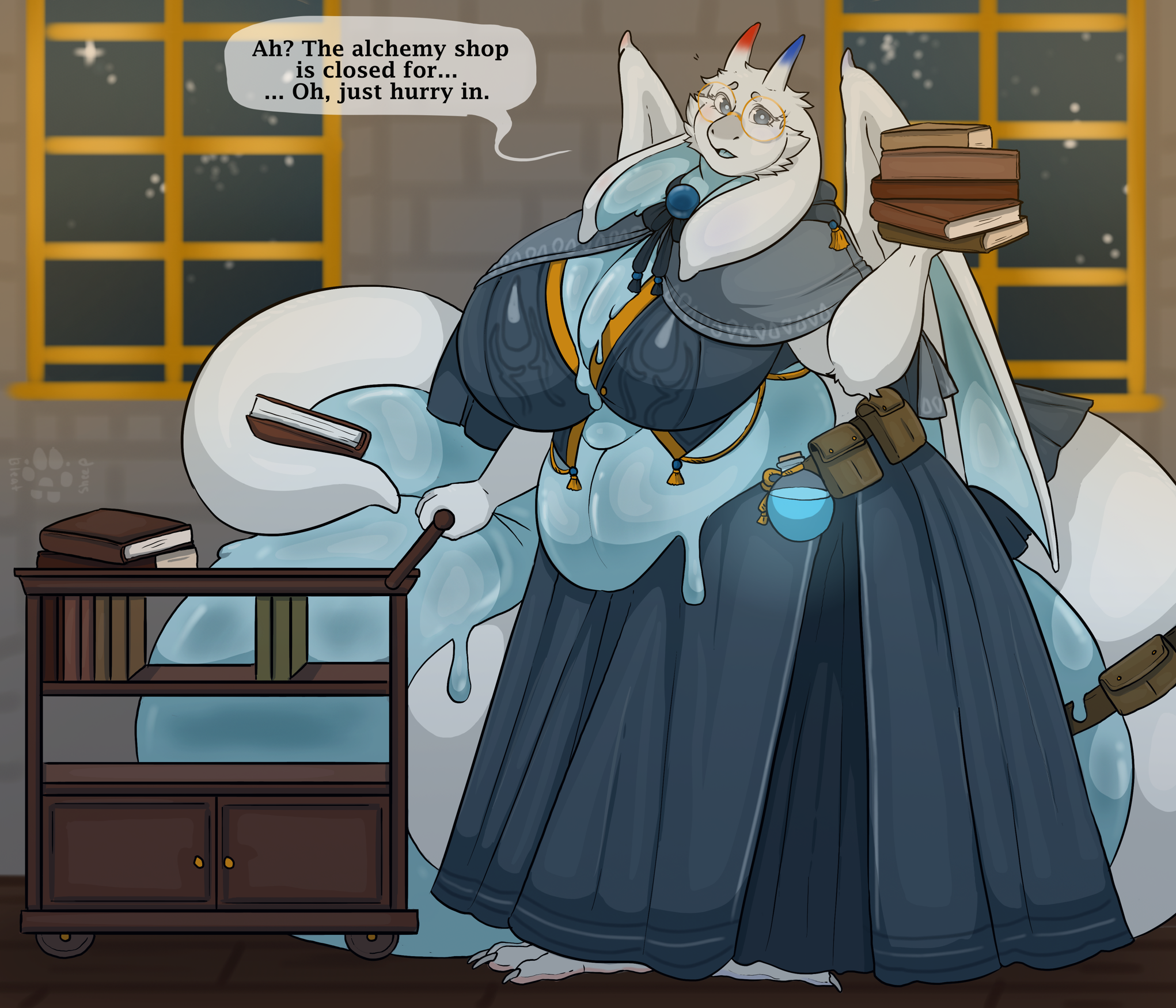 Áinewyn loves working two different jobs, by day she works as an Alchemist at the local Apothecary and by night she works in the Library, at the big house across from the Town Hall. Áinewyn grew up love reading books which got her interested in alchemy. Her favorite book is Craftician of the Arts, the very book that got her start in alchemy, and specializes in making healing potions. She makes various potions from her goo that secretes from her own body brewing them into healing potions to cure various ailments and poisons.