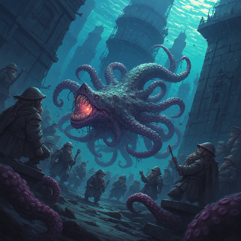 After what felt like an agonizingly long swim through the immense tunnels, though it was likely less than ten minutes, we found ourselves in the Hall of Heroes. The statue garden is as grand as we have heard it to be, with sculptures of great dwarven personages lining the hall, numerous plaques detailing their achievements within their epitaphs. Entering the garden, we found a considerable number of alien creatures lazily swimming about, aimlessly and without purpose. They were hideous to behold, many baring tentacles, claws and horrible maws. Some were larger than full grown men. Amongst these horrors swam fish creatures that looked to be the full realization of what the scavengers were becoming, though a number of them were still in the process of transforming. We kept our light low and dim as much as we dared, and though our eyes were up to the task of seeing without much illumination, Liam’s were a different matter. We needed to lead him as best we could.