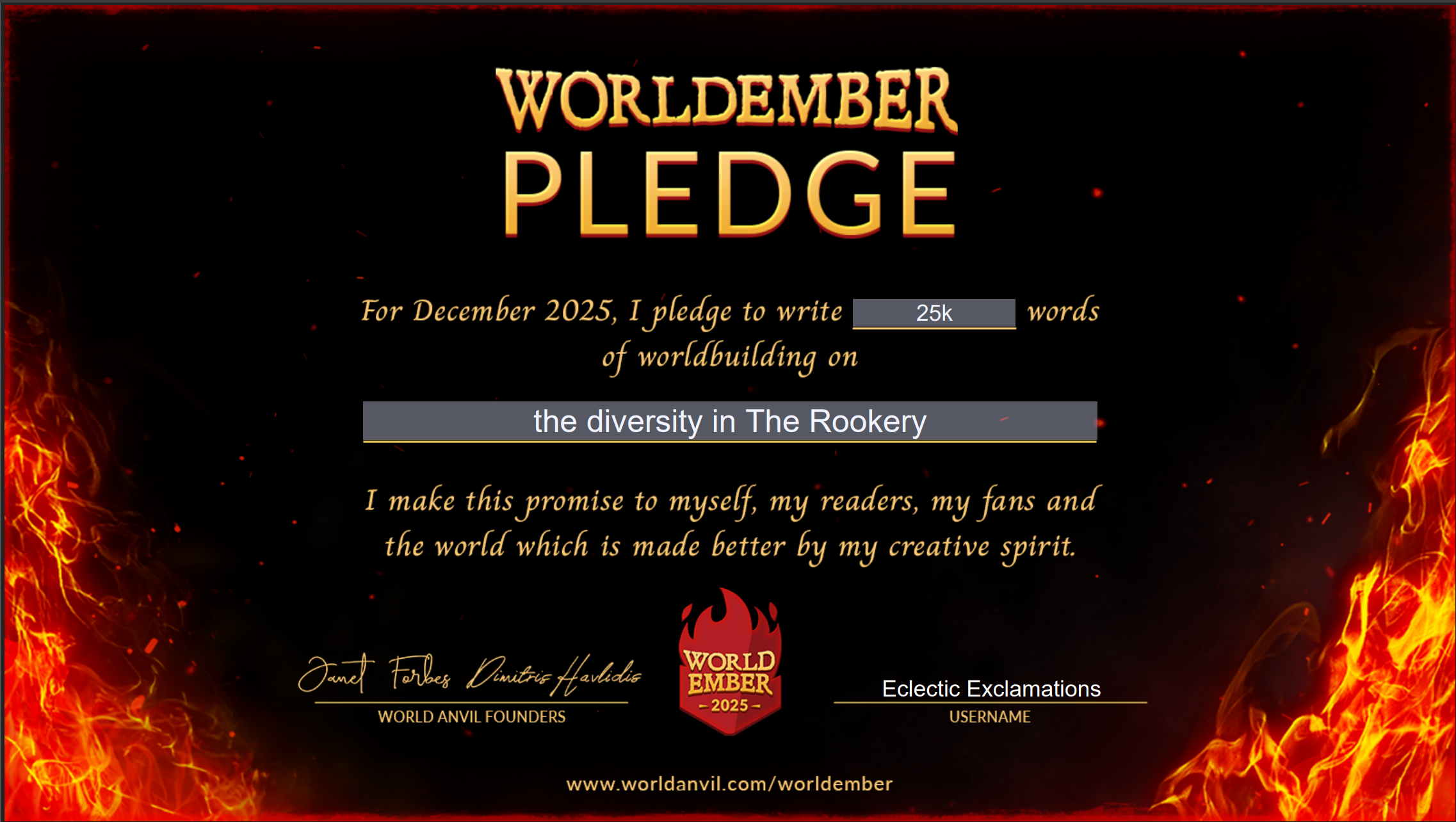 In addition to the characters already created I will add more diverse characters both from the perspective of race and temperament. The world of The Rookery is very like our own with a wide range of welcoming to hostile, accepting to prejudiced.