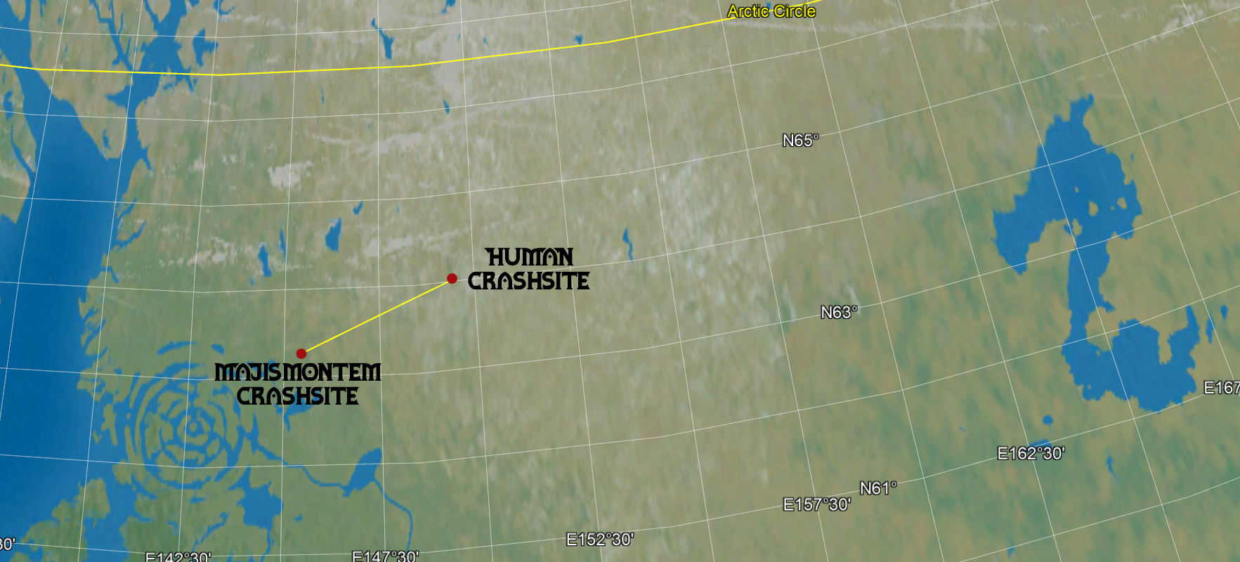 Crash Site is located on barren, mountainous tundra, situated in a valley. A road runs past the mouth of the valley from the south to a majismotem crash site. The humans are able to farm in greenhouses utilizing grow lights powered by the ship engines.
