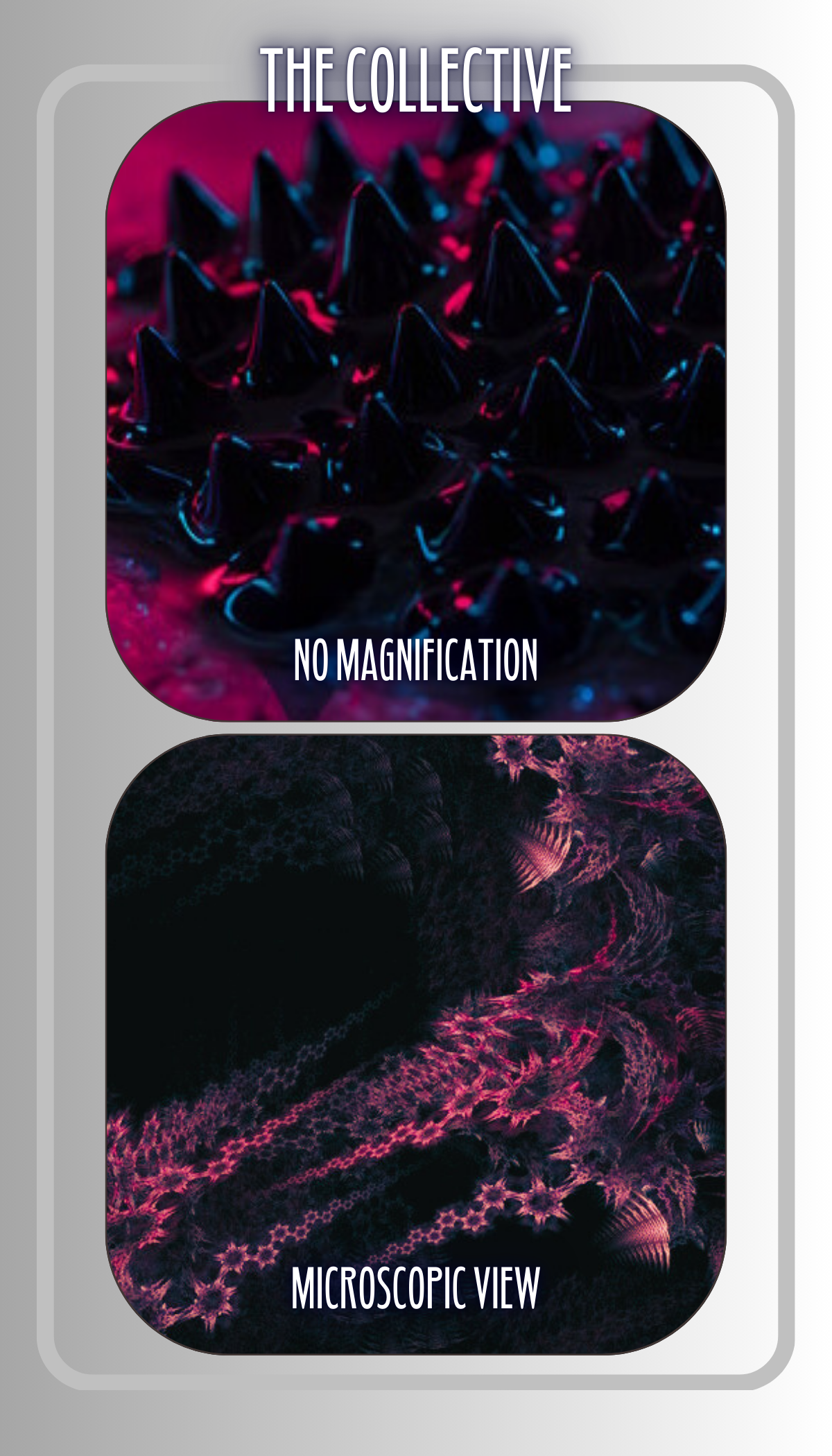 The Collective exists as a fractal fluid - regardless of how great the magnification, its structure endlessly repeats itself. When observed with the naked eye, they are a dark indigo/crimson. On a microscopic level, they appear as dark crimson mold spores, each identical, with a fractal-like internal structure.