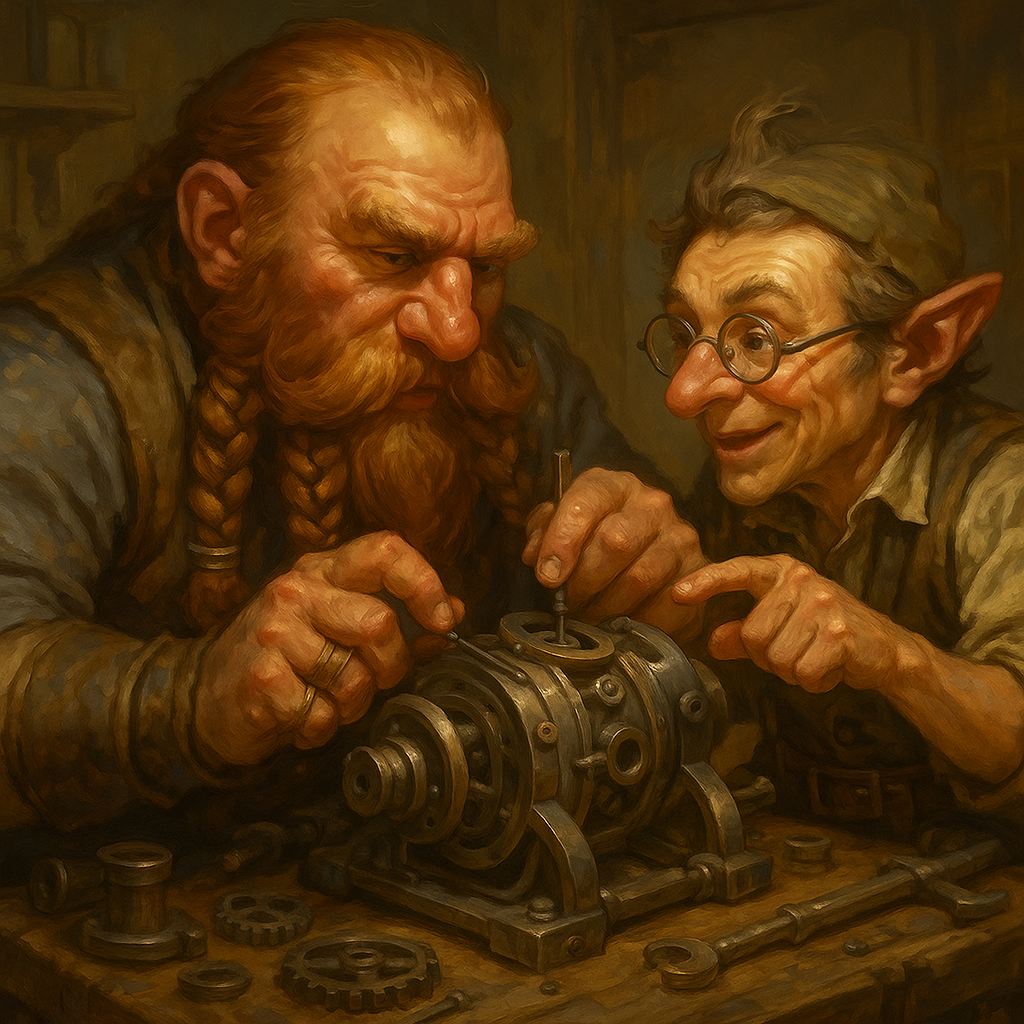 Their closest allies are Gnomes, with whom they share an ancient alliance rooted in mutual innovation, underground living, and complementary skillsets. While dwarves favor solid, functional craftsmanship, gnomes bring creativity and eccentric brilliance to shared projects. The two peoples often cohabitate in mixed settlements or neighboring tunnels, with dwarves handling structural integrity and metallurgy, and gnomes contributing alchemical knowledge, intricate mechanisms, or magical enhancements. Some dwarves joke that gnomes make the mess and dwarves make it last.