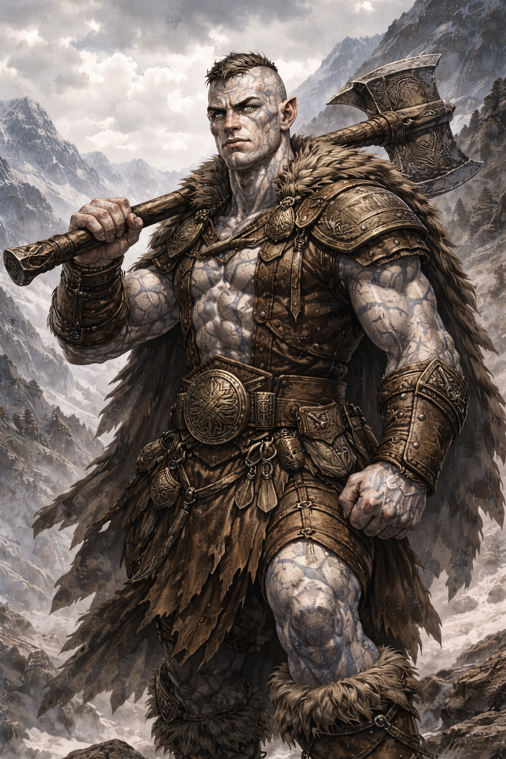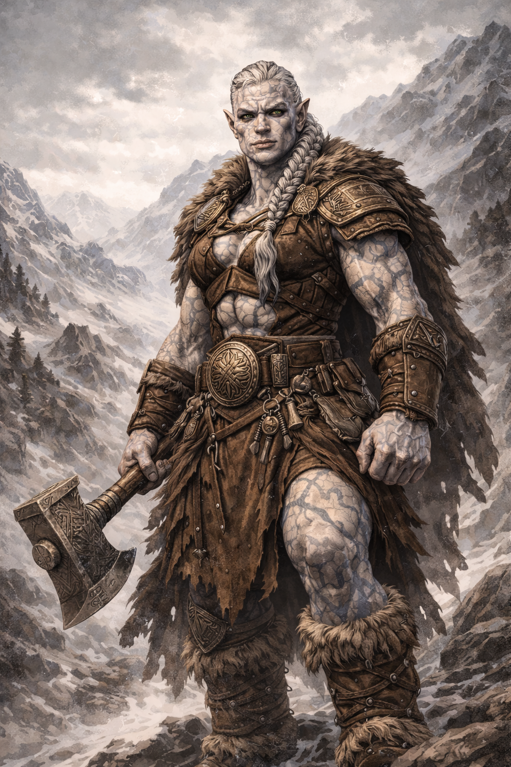 Physically, goliaths are towering humanoids with dense musculature, thick bone structure, and stone-like skin tones ranging from pale granite to deep slate, often marked by natural marbling or mineral veining. These markings are not tattoos; they are biological traits and are treated as identifiers of lineage, region, or personal history.