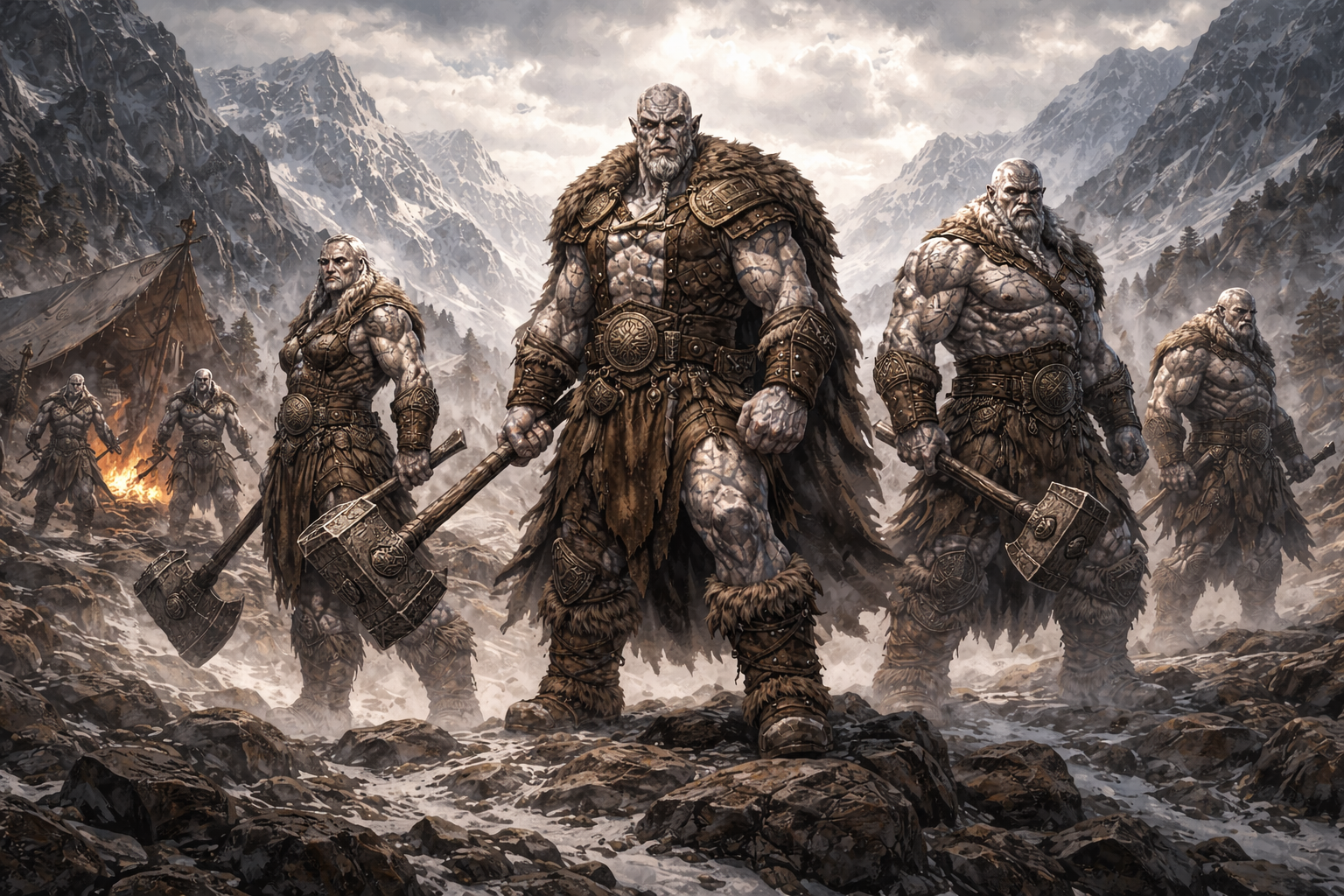 The largest and most culturally influential goliath populations are found in southern Kalros, where Frost Goliath clans occupy the mountain chains and elevated highlands that form natural borders between clan territories. These regions serve as critical transit corridors and defensive strongholds, placing goliaths in long-standing roles as wardens of passes, neutral groundkeepers, and route guardians.