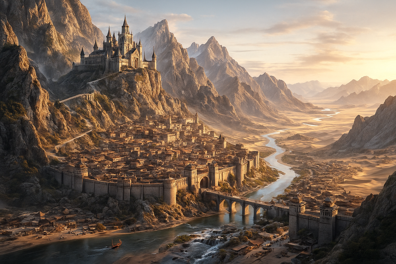 Kha’Zadun is large, old, and shaped by two dominant forces: the Desert Kingdom of Dhuma’s governance and the shadow-presence of the Order of Arelian, whose mountain monastery and the Temple of Unity define the city’s identity. The city’s layout presses against the Zandari Mountains, spreading outward in walled rings that follow the natural stone slopes.